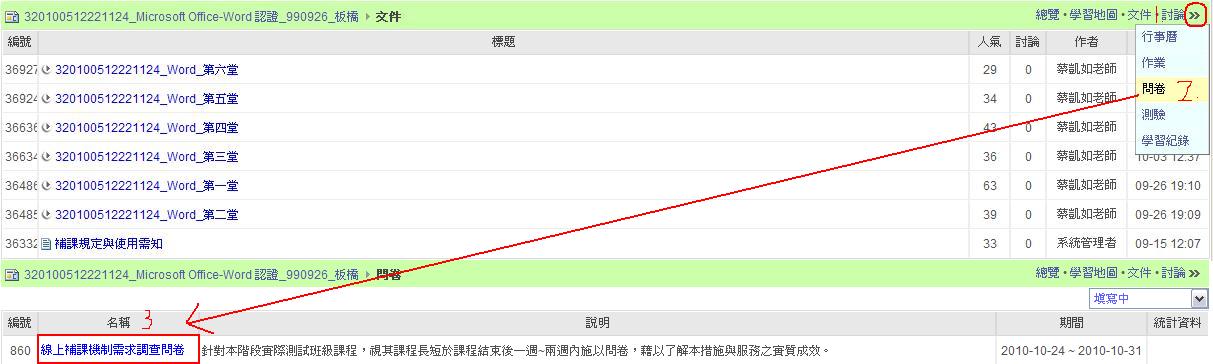 1.先點選需執行問卷的課程,「補課專區」\「XX課程」 2.點選右上方「>>」符號,出現選單 3.選擇選單中的「問卷」 4.點選「線上補課機制需求調查問卷」的連結,便可進行問卷